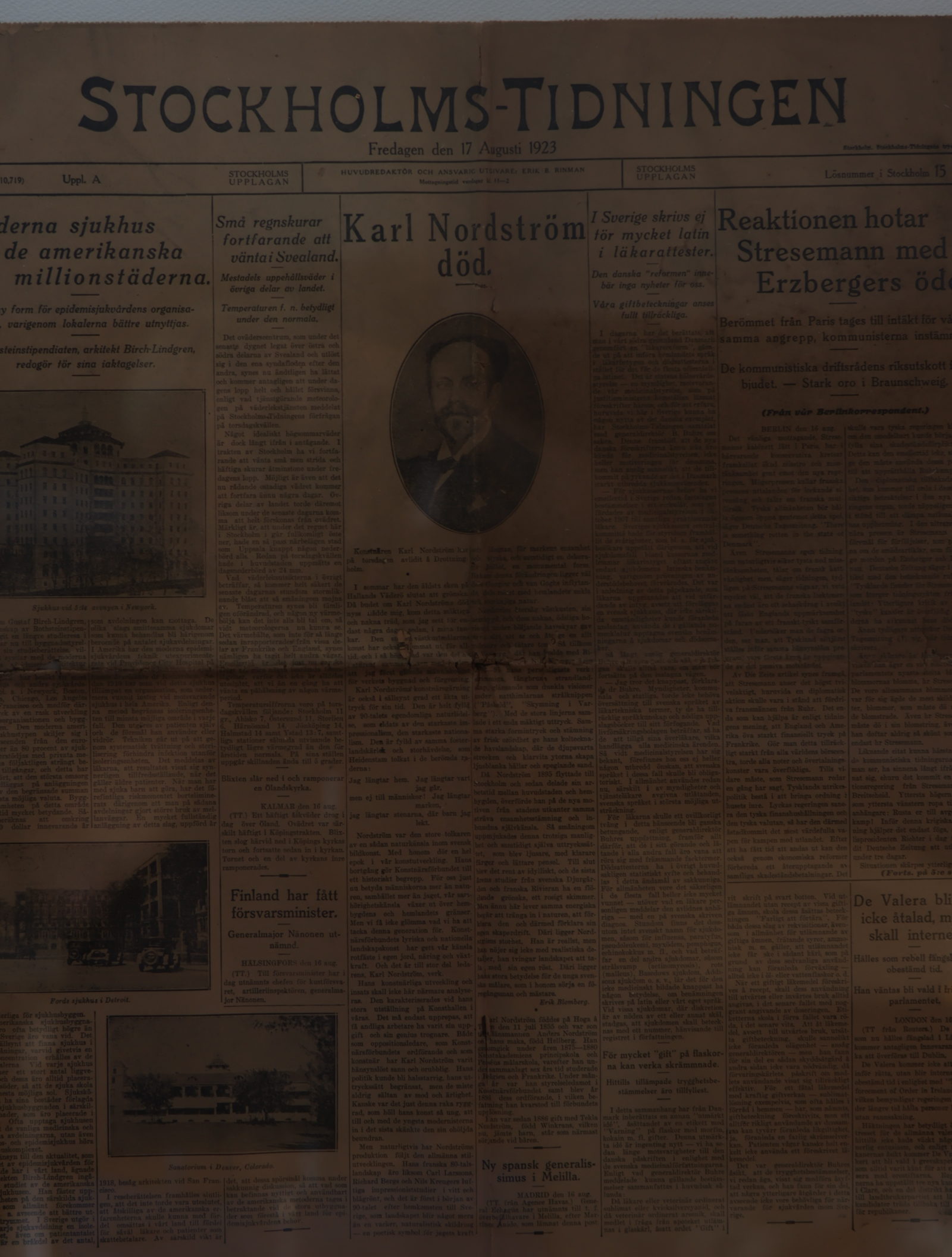 Förstasidan på Stockholmtidningens nummer den 17 augusti 1923